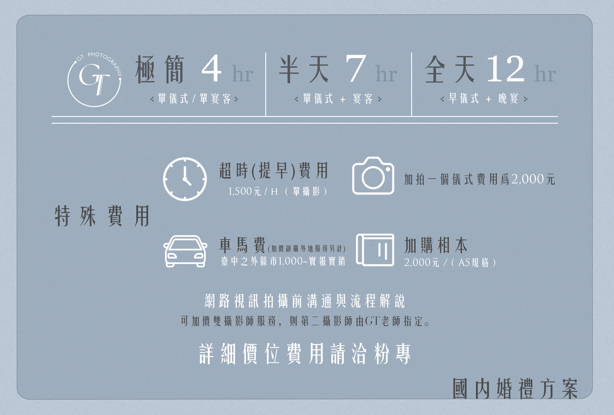 (所有方案GT單人雙機作業,包含一位助理協助開車注意當天流程)